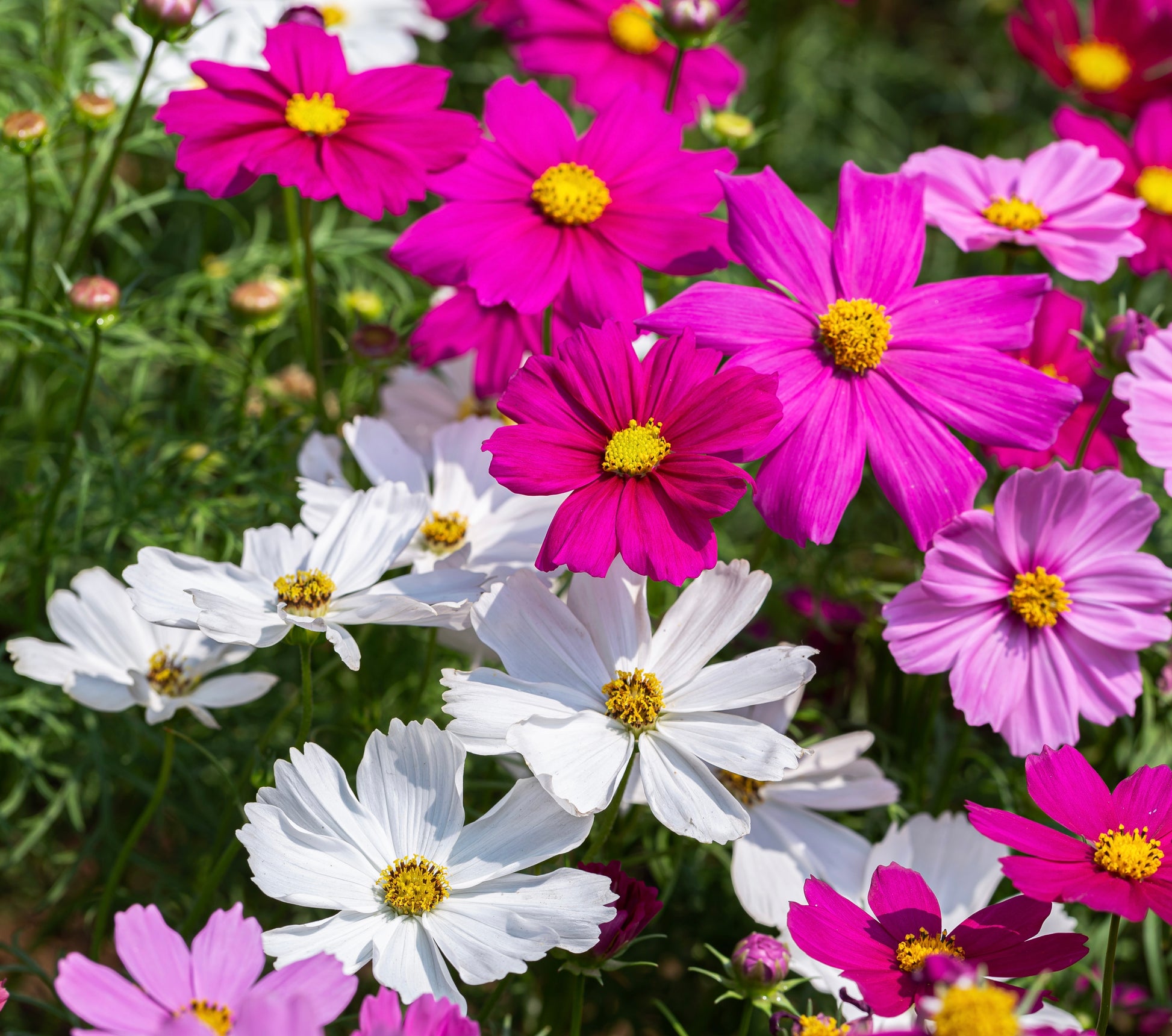 For flower beds and borders, these Cosmos Dwarf Mix seeds provide a stunning display of pinks and whites. Their daisy-like shapes and sunny yellow cores enhance their lovely appeal! Will be beautiful in a bouquet of cut flowers and will draw plenty of pollinators. Large drifts of this annual plant are grown for a spectacular summer display.